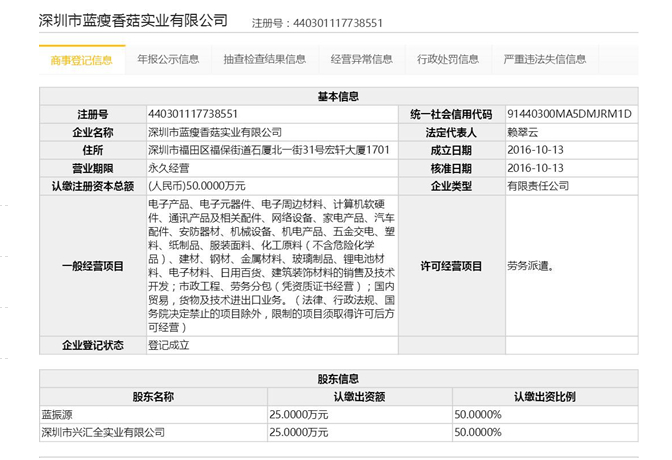 工商資料顯示,這家公司成立有兩名股東,其中包括深圳市興匯全實業有限公司和藍振源,兩家公司各自認繳出資25萬元。深圳市藍瘦香菇實業有限公司的高層管理人員中,賴翠云為執行(常務)董事、總經理,藍振源為監事。